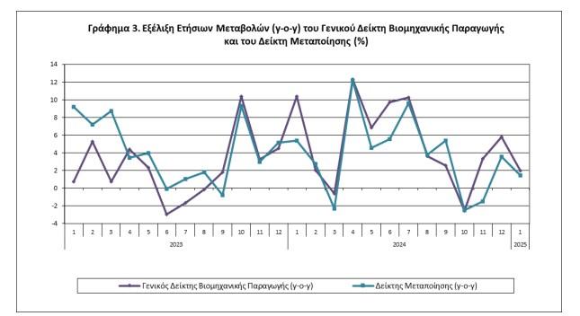 Όπως ανακοίνωσε η ΕΛΣΤΑΤ, ο γενικός δείκτης βιομηχανικής παραγωγής παρουσίασε αύξηση 2% τον Ιανουάριο 2025 σε σύγκριση με τον αντίστοιχο δείκτη του Ιανουαρίου 2024, έναντι αύξησης 10,3% που σημειώθηκε κατά την αντίστοιχη σύγκριση το 2024 με το 2023.