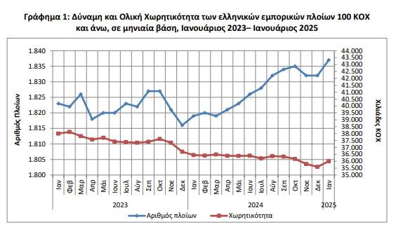 Επίσης, η ολική χωρητικότητα του ελληνικού εμπορικού στόλου (πλοία 100 κόρων και άνω) ανήλθε σε 35.599.749 κόρους και παρουσίασε μείωση 2,3% σε σύγκριση με την αντίστοιχη χωρητικότητα του Ιανουαρίου 2024. Μείωση 4,1% είχε σημειωθεί κατά την αντίστοιχη σύγκριση του Ιανουαρίου 2024 προς τον Ιανουάριο 2023.