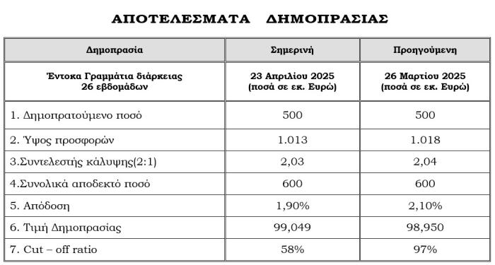 Έγιναν δεκτές προσφορές μέχρι του ύψους του δημοπρατηθέντος ποσού, καθώς και μη ανταγωνιστικές προσφορές ύψους 100 εκατ. ευρώ. Δε θα γίνουν αποδεκτές συμπληρωματικές μη ανταγωνιστικές προσφορές την Πέμπτη 24 Απριλίου 2025. Σημειώνεται ότι κατά τις δημοπρασίες δεν καταβάλλεται προμήθεια.