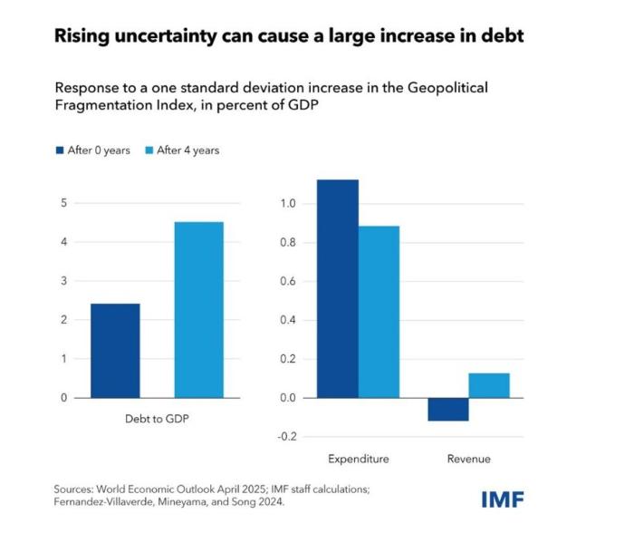 Η εντεινόμενη γεωοικονομική αστάθεια μπορεί να προκαλέσει περαιτέρω αύξηση του δημόσιου χρέους. Το ΔΝΤ εκτιμά ότι μια σημαντική αύξηση της αβεβαιότητας θα μπορούσε να προσθέσει έως και 4,5% του ΑΕΠ στο χρέος μεσοπρόθεσμα, με κάποιες προβλέψεις να δείχνουν ακόμη και 117% του ΑΕΠ έως το 2027 – το υψηλότερο επίπεδο από τον Β’ Παγκόσμιο Πόλεμο. Αυτό θα μπορούσε να περιορίσει τη δυνατότητα των κρατών να στηρίξουν ευάλωτους πληθυσμούς ή να χρηματοδοτήσουν απαραίτητες επενδύσεις.