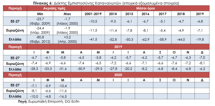 - στην Καταναλωτική Εμπιστοσύνη, οι προβλέψεις των νοικοκυριών για την οικονομική κατάσταση της χώρας αλλά και την οικονομική κατάσταση του νοικοκυριού τους υποχωρούν έντονα, ενώ οι εκτιμήσεις για μείζονες αγορές περιορίζονται οριακά όπως και η πρόθεση για αποταμίευση.
