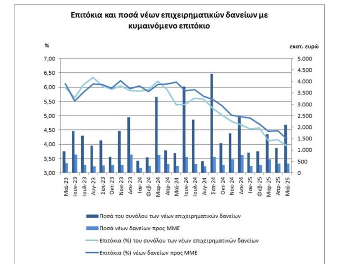 Σύμφωνα και με τα στοιχεία της ΤτΕ, τον Μάιο του 2025, τα μέσα σταθμισμένα επιτόκια των νέων καταθέσεων και δανείων μειώθηκαν στο 0,35% και 4,66% αντίστοιχα. Το περιθώριο επιτοκίου μεταξύ των νέων καταθέσεων και δανείωνμειώθηκε στις 4,31 εκατοστιαίες μονάδες.