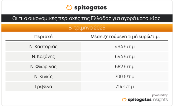 Οι χαμηλότερες τιμές για αγορά κατοικίας στην Ελλάδα κατά το δεύτερο τρίμηνο του 2025 καταγράφηκαν σε Καστοριά, Κοζάνη, Φλώρινα, Κιλκίς και Γρεβενά.