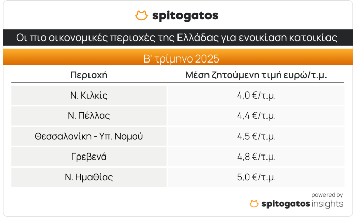 Στην ενοικίαση, οι χαμηλότερες ΜΖΤ ενοικίασης σπιτιού εντοπίζονται στο Κιλκίς, την Πέλλα και το υπόλοιπο Νομού Θεσσαλονίκης. Γρεβενά και Ημαθία ολοκληρώνουν την κατάταξη των πιο οικονομικών περιοχών, με ΜΖΤ ενοικίασης στα 4,8 ευρώ/τ.μ. και 5,0 ευρώ/τ.μ. αντίστοιχα.