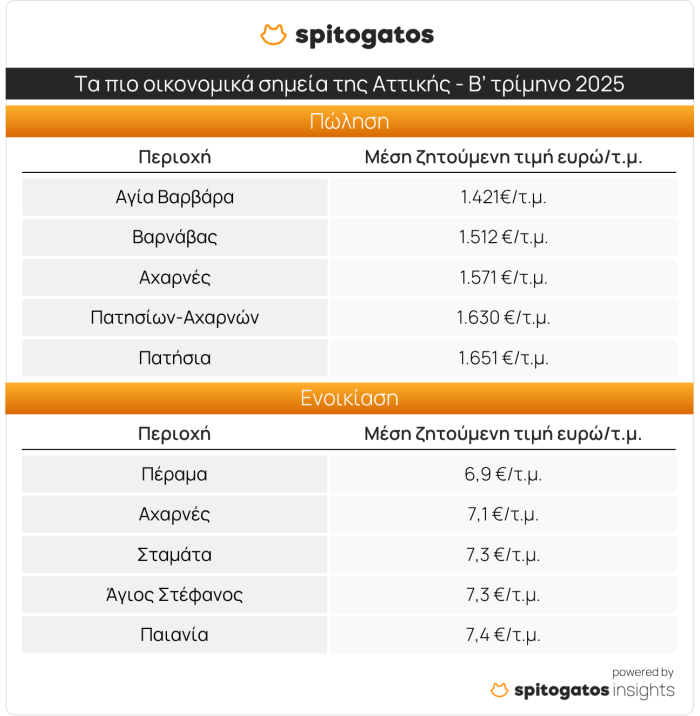 Όσον αφορά την Αττική συγκεκριμένα, περιοχές των Δυτικών και Ανατολικών Προαστίων, καθώς και του κέντρου της Αθήνας, κατατάσσονται στις 5 πιο οικονομικές επιλογές για αγορά κατοικίας. Συγκεκριμένα, οι πιο οικονομικές περιοχές της Αττικής για αγορά είναι η Αγία Βαρβάρα, ο Βαρνάβας, οι Αχαρνές — με ΜΖΤ πώλησης στα 1.571 €/τ.μ. — η περιοχή Πατησίων - Αχαρνών και τα Πατήσια. Στον τομέα της ενοικίασης, η πιο οικονομικά προσιτή περιοχή της Αττικής, κατά το δεύτερο τρίμηνο του 2025, είναι το Πέραμα, με ΜΖΤ 6,9 €/τ.μ. Αμέσως μετά, ακολουθούν οι Αχαρνές, η Σταμάτα, ο Άγιος Στέφανος και η Παιανία.