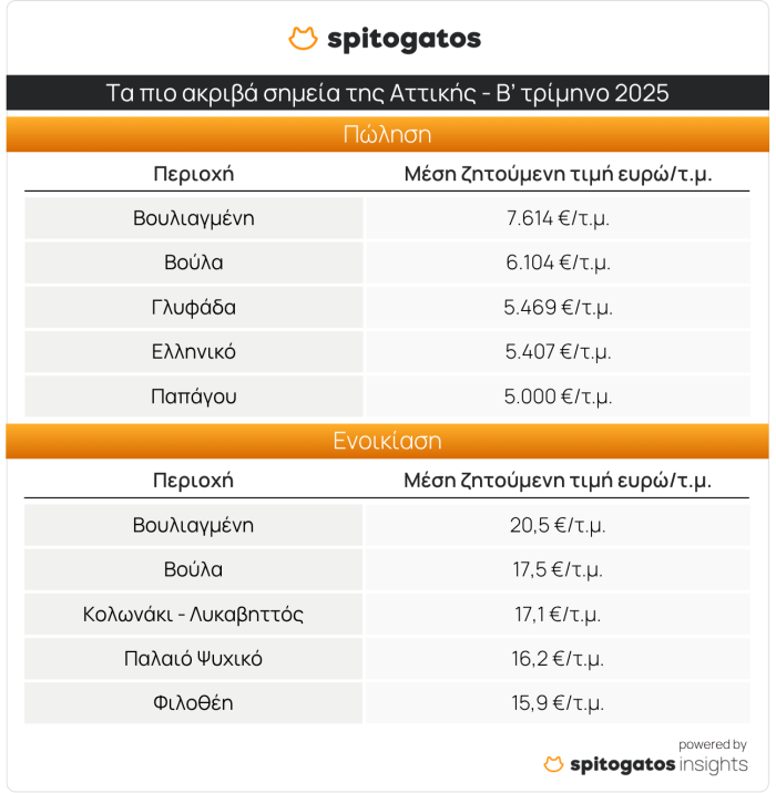 Η Βουλιαγμένη και η Βούλα είναι οι πιο ακριβές περιοχές τόσο για αγορά όσο και για ενοικίαση κατοικίας στην Αττική. Σε ό,τι αφορά την αγορά κατοικίας, η Γλυφάδα, το Ελληνικό και η περιοχή Παπάγου συμπληρώνουν την πεντάδα των πιο ακριβών περιοχών της Αττικής.