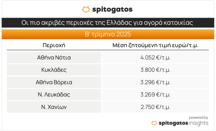 Τα «σκήπτρα» για την πιο ακριβή τιμή ανά τετραγωνικό μέτρο για αγορά κατοικίας συνεχίζουν να κρατούν τα Νότια Προάστια της Αθήνας, με ΜΖΤ 4.052 ευρώ/τ.μ. Ακολουθούν οι Κυκλάδες, τα Βόρεια Προάστια της Αθήνας, η Λευκάδα και τα Χανιά.