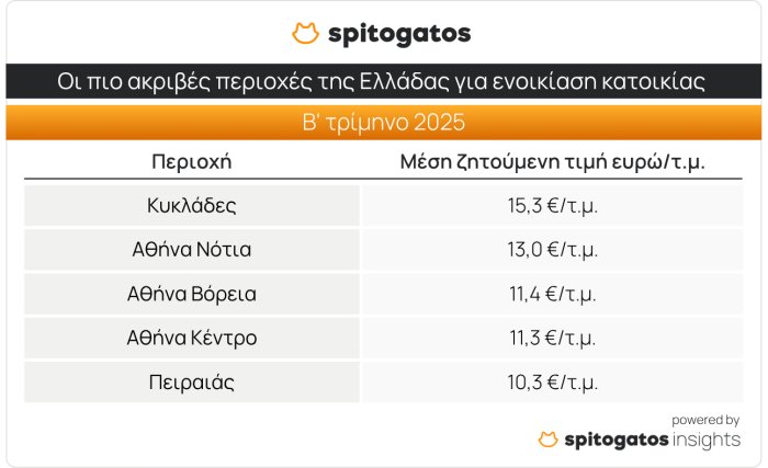 Όσον αφορά τον κομμάτι της ενοικίασης, στο top 5 των πιο ακριβών περιοχών της χώρας βρίσκονται οι Κυκλάδες, τα Νότια και τα Βόρεια Προάστια της Αθήνας με ΜΖΤ 15,3 ευρώ/τ.μ., 13,0 ευρώ/τ.μ. και 11,4 ευρώ/τ.μ. αντίστοιχα. Το top 5 συμπληρώνουν ο Δήμος Αθηναίων και ο Πειραιάς.