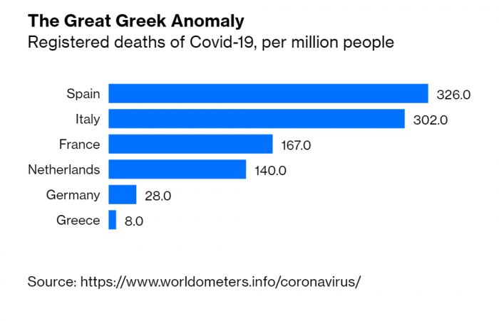 Μέχρι στιγμής, η Ελλάδα έχει καταγράψει μόνο 1.955 κρούσματα και 86 θανάτους - δηλαδή 188 περιπτώσεις και 8 θανάτους ανά εκατομμύριο ανθρώπους. Η Ισπανία έχει 3.261 περιπτώσεις και 326 θανάτους ανά εκατομμύριο και η Ιταλία έχει αντίστοιχα 2.375 και 302 άτομα. Αυτό μπορεί να οφείλεται στο γεγονός ότι η Ελλάδα έχει κάνει λιγότερες από τις μισές δοκιμές (ανά εκατομμύριο ανθρώπους) όπως η Ισπανία και λιγότερο από το ένα τέταρτο της Ιταλίας , αλλά δεν υπάρχουν ενδείξεις ότι η πίεση στο σύστημά της υγειονομικής περίθαλψης είναι συγκρίσιμη με αυτή που υφίστανται οι τελευταίες δύο χώρες. Η ελληνική κυβέρνηση αναφέρει επίσης ότι έχει προσλάβει 4.200 νέους γιατρούς και αυξήθηκε κατά το ήμισυ ο αριθμός των ΜΕΘ, γεγονός που θα βοηθήσει να περιοριστεί η επιδείνωση της εστίας.