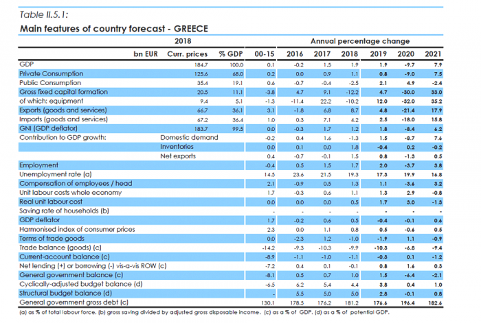 Όπως αναφέρει η έκθεση της Κομισιόν για την Ελλάδα: «Η οικονομία της Ελλάδας εισήλθε το 2020 με σχετικά θετική πορεία. Η αύξηση του ΑΕΠ το 2019 έφτασε το 1,9%, οριακά χαμηλότερα των προσδοκιών. Η ανάπτυξη στηρίχθηκε στην εγχώρια ζήτηση και λιγότερο στις εξαγωγές. Η αγορά εργασίας εμφάνισε βελτίωση και η απασχόληση αυξήθηκε κατά 2%, με αποτέλεσμα τη περαιτέρω μείωση της ανεργίας στο 17,3% για το 2019.