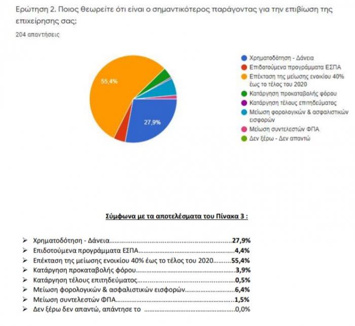 Στην ερώτηση ποιο παράγοντα θεωρούν σημαντικότερο, οι έμποροι, για την επιβίωση της επιχείρησης, ένας στους δύο κρίνει ως σημαντικότερο παράγοντα βιωσιμότητας την επέκταση της μείωσης του ενοικίου έως το τέλος του έτους. Ως δεύτερος σημαντικότερος παράγοντας καταγράφηκε η χρηματοδότηση μέσω δανείων, για την άμεση αύξηση της ρευστότητας των επιχειρήσεων.
