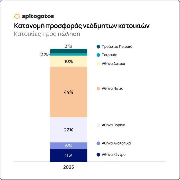 Σύμφωνα με τα στοιχεία του Spitogatos, πάνω από το 60% των διαθέσιμων νεόδμητων κατοικιών στην Αττική συγκεντρώνεται στα Νότια και στα Βόρεια Προάστια, όπου καταγράφονται και οι υψηλότερες μέσες ζητούμενες τιμές πώλησης, ενώ το αντίστοιχο ποσοστό είναι πολύ χαμηλότερο στον Δήμο Αθηναίων και στα Δυτικά Προάστια.