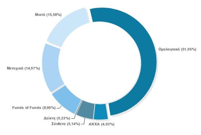 Από την πίτα, τη τη μερίδα του λέοντος έχουν τα ομολογιακά αμοιβαία κεφάλαια που αποτελούν το 51,05% του ενεργητικού, αφού επενδυτές και αποταμιευτές που αναζητούν μια προβλέψιμη και χαμηλού ρίσκου λύση τα επιλέγουν καθημερινά. Η σύνθεση της αγοράς ΟΣΕΚΑ συμπληρώνεται από τα μικτά Α/Κ με 15,58% και τα μετοχικά με 14,97%.