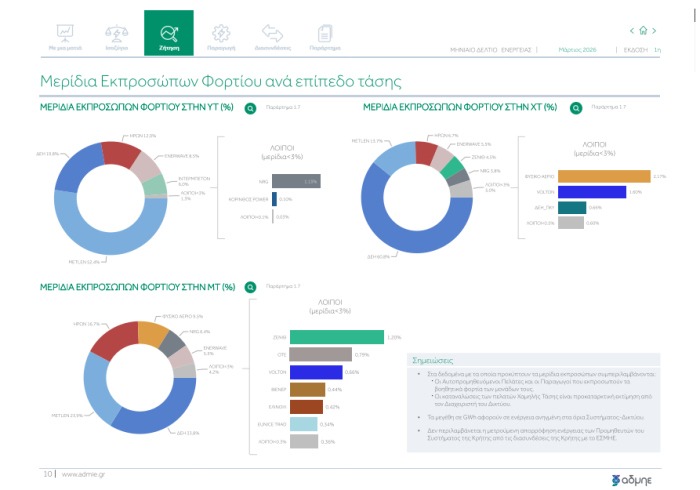 Σημαντικό στοιχείο του μήνα αποτελεί και η ενίσχυση του εξαγωγικού χαρακτήρα της χώρας μας, με τις εξαγωγές ηλεκτρικής ενέργειας να εκτινάσσονται στις 1.184 GWh, αυξημένες κατά 204,83% σε σχέση με τον Μάρτιο του 2025.