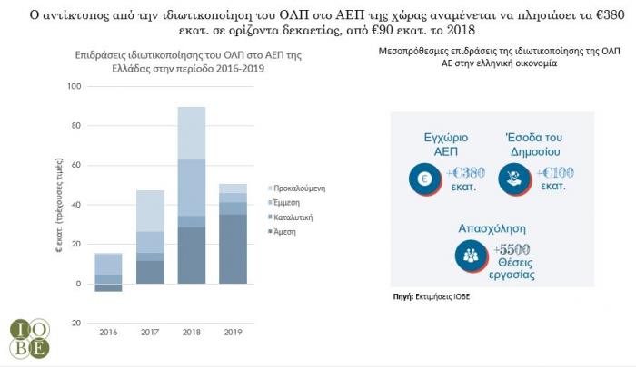 Καταλυτικό ρόλο στην ενίσχυση των επενδύσεων και τη δημιουργία θέσεων εργασίας διαδραματίζουν οι ιδιωτικοποιήσεις, ενώ υπολογίζεται ότι πρόσθεσαν στο ΑΕΠ 1 δισ. ευρώ ετησίως, την περίοδο 2011 - 2019, όπως αναφέρει μελέτη του ΙΟΒΕ, όπου, μεταξύ άλλων, τονίζεται ότι για κάθε ευρώ αρχικού εσόδου από ιδιωτικοποιήσεις επενδύεται στην οικονομία 1,02 ευρώ.