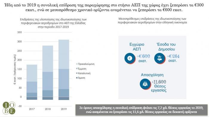 Ισχυρές επιδράσεις στην οικονομία καταγράφονται και στην περίπτωση της παραχώρησης της διαχείρισης των 14 περιφερειακών αερολιμένων στην Fraport Greece. Για τον εκσυγχρονισμό, την ανάπτυξη και την επέκταση των υποδομών των αεροδρομίων, η εταιρεία υλοποιεί επενδύσεις που θα ξεπεράσουν τα €463 εκατ. ως το τέλος του 2020. Σε ορίζοντα δεκαετίας από την ιδιωτικοποίηση η ετήσια επίδραση στο ΑΕΠ αναμένεται να φτάσει τα €630 εκατ., ενώ σε όρους απασχόλησης αναμένεται να ανέλθει σε 11,6 χιλ. θέσεις εργασίας.