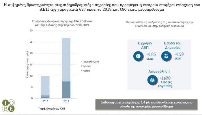 Επίσης, από τα περιφερειακά αεροδρόμια η επίδραση στο ΑΕΠ ξεπερνάει το 1 δισ. ευρώ δημιουργώντας πάνω από 10 χιλ. θέσεις εργασίας μεσοπρόθεσμα, ενώ από την επένδυσή στο Αστήρ Παλάς Βουλιαγμένης το ΑΕΠ θα είναι αυξημένο κατά 50 εκατ. ευρώ, με περίπου 1.000 επιπλέον θέσεις εργασίας στο σύνολο της οικονομίας μεσοπρόθεσμα, ενώ 1,4 χιλ. επιπλέον θέσεις εργασίας, σε βάθος χρόνου θα προκύψουν από την ιδιωτικοποίηση της ΤΡΑΙΝΟΣΕ ενισχύοντας ως 86 εκατ. ευρώ επιπλέον το ΑΕΠ.