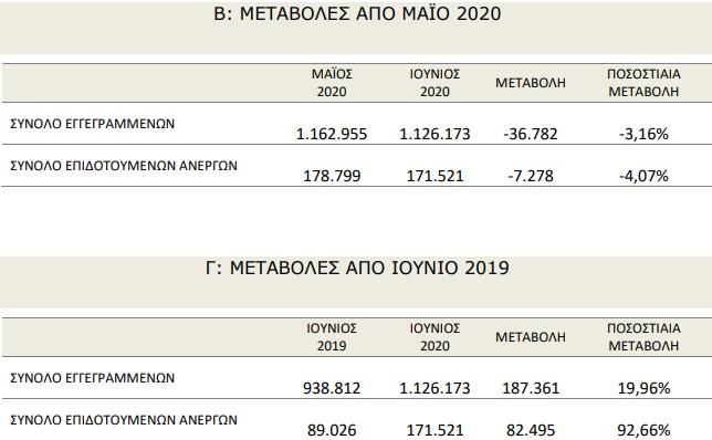 Αναλυτικότερα, σύμφωνα με τα στατιστικά στοιχεία του Οργανισμού Απασχόλησης Εργατικού Δυναμικού (ΟΑΕΔ), το σύνολο των εγγεγραμμένων ανέργων, με κριτήριο την αναζήτηση εργασίας (αναζητούντων εργασία), τον Ιούνιο του 2020, ανήλθε σε 1.068.856 άτομα. Από αυτά, 536.144 (ποσοστό 50,16%) είναι εγγεγραμμένα στο μητρώο του ΟΑΕΔ για χρονικό διάστημα ίσο ή και περισσότερο των 12 μηνών και 532.712 (ποσοστό 49,84%) είναι εγγεγραμμένα στο μητρώο του ΟΑΕΔ για χρονικό διάστημα μικρότερο των 12 μηνών. Οι άνδρες ανήλθαν σε 391.401 (ποσοστό 36,62%) και οι γυναίκες ανήλθαν σε 677.455 (ποσοστό 63,38%).