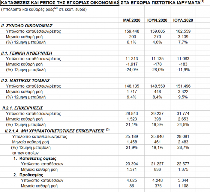 Εντυπωσιακό είναι, δε, το γεγονός ότι το σύνολο των καταθέσεων στον ιδιωτικό τομέα στα τέλη Ιουλίου 2020 ξεπέρασε τα 151 δισ. ευρώ, με την ετήσια άνοδο να φθάνει στο 9,5%. Επιπρόσθετα οι καταθέσεις των νοικοκυριών αυξήθηκαν κατά 669 εκατ., ξεπερνώντας στα τέλη Ιουλίου στο επίπεδο των 28 δισ. ευρώ, με ετήσια ενίσχυση της τάξης του 28.7%.