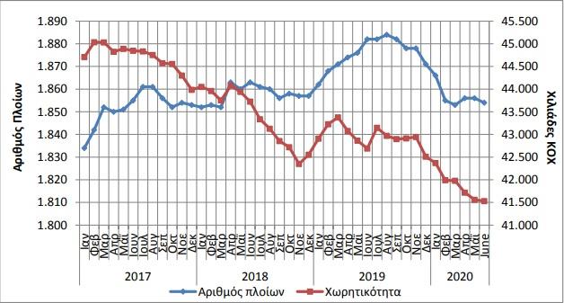 Σύμφωνα επίσης με την ΕΛΣΤΑΤ, η ολική χωρητικότητα του ελληνικού εμπορικού στόλου (πλοία 100 κόρων και άνω) ανήλθε σε 41.529.418 κόρους και παρουσίασε μείωση 2,7% σε σύγκριση με την αντίστοιχη χωρητικότητα του Ιουνίου 2019.