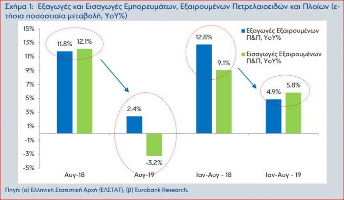 Σύμφωνα με την Eurobank ο ετήσιος ρυθμός αύξησης των ελληνικών εξαγωγών εμπορευμάτων παρουσίασε επιβράδυνση το 8-μηνο Ιανουαρίου – Αυγούστου 2019. Συγκεκριμένα, μειώθηκε στο 1,9% ή κατά 417,4 εκατ. ευρώ από 17,8% ή 3.318,5 εκατ. ευρώ το αντίστοιχο διάστημα πέρυσι.