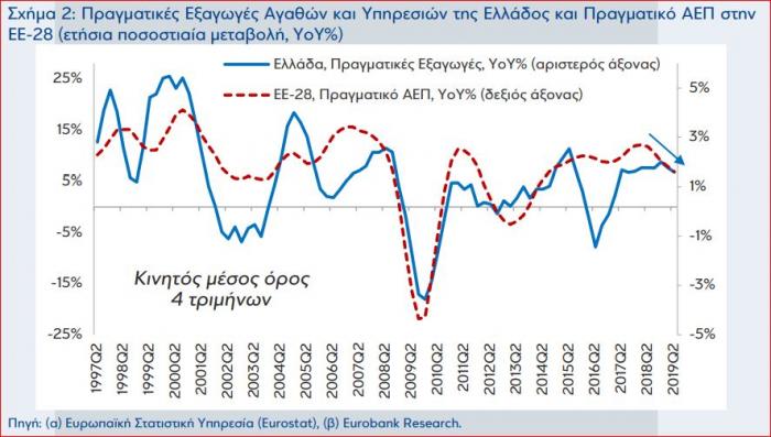 Όπως σημειώνουν οι οικονομολόγοι της Eurobank, η επιβράδυνση του πραγματικού ρυθμού μεγέθυνσης σημαντικών εμπορικών εταίρων της Ελλάδος όπως είναι η ΕΕ-28 και η Ευρωζώνη, συνιστά ένα αρνητικό ρίσκο για την πορεία ανάκαμψης της ελληνικής οικονομίας.