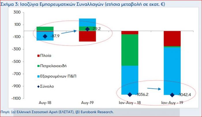 Βάσει των παραπάνω στοιχείων και της αντίστοιχης πορείας των εισαγωγών, το εμπορικό έλλειμμα διευρύνθηκε σε ετήσια βάση κατά €1.042,4 εκατ. (από -€13.545,6 στα -€14.588,0 εκατ.) το 8-μηνο Ιανουαρίου-Αυγούστου 2019.