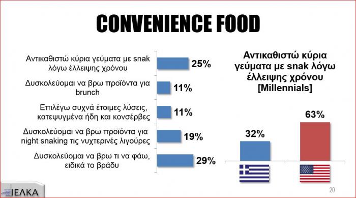 Ιδιαίτερα σημαντική είναι η τέταρτη τάση που εμφανίζεται ιδιαίτερα στις νεαρές ηλικίες και αφορά στην στροφή της αντικατάστασης του βασικού γεύματος με σνακ. Το «snacking» φαίνεται να διευρύνει πάρα πολύ την θέση του στις ελληνικές συνήθειες καθώς το 25% των ερωτηθέντων δηλώνει ότι αντικαθιστά κύρια γεύματα με snack λόγω έλλειψης χρόνου, με την τακτική αυτή να ακολουθείται κατά 32% από την κατηγορία των millennials. Εξίσου σημαντικό ποσοστό της τάξεως του 29% από το σύνολο των ερωτηθέντων στρέφεται στα σνακ για να καλύψει τις ανάγκες για βραδινό.