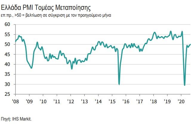 Ο κύριος Δείκτης Υπευθύνων Προμηθειών της IHS Markit για τον τομέα μεταποίησης στην Ελλάδα (Purchasing Managers’ Index® – PMI®) έκλεισε στις 50 μονάδες στο τέλος του τρίτου τριμήνου, τιμή υψηλότερη από τις 49,4 μονάδες του Αυγούστου. Ο κύριος δείκτης κατέγραψε την υψηλότερη τιμή από τον Φεβρουάριο, ενώ η μέση τιμή τριμήνου υπέδειξε μικρή συρρίκνωση των λειτουργικών συνθηκών, ουσιαστικά βελτίωση σε σύγκριση με τη σημαντική επιδείνωση που παρατηρήθηκε κατά τη διάρκεια του δεύτερου τριμήνου του 2020.