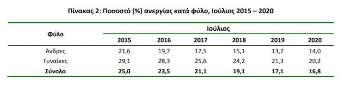 Οι άνεργοι μειώθηκαν κατά 31.386 άτομα σε σχέση με τον Ιούλιο του 2019 (μείωση 3,9%) και κατά 69.395 άτομα σε σχέση με τον Ιούνιο του 2020 (μείωση 8,2%).