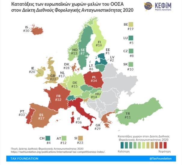 Στην 29η θέση ανάμεσα στις 36 χώρες του ΟΟΣΑ κατατάσσεται η Ελλάδα, με βελτίωση της συνολικής επίδοσης κατά 2,5 μονάδες, σύμφωνα με τον φετινό Δείκτη Διεθνούς Φορολογικής Ανταγωνιστικότητας του Tax Foundation που αξιοποιεί στοιχεία του 2019 και παρουσιάζεται στην Ελλάδα από το ΚΕΦίΜ.