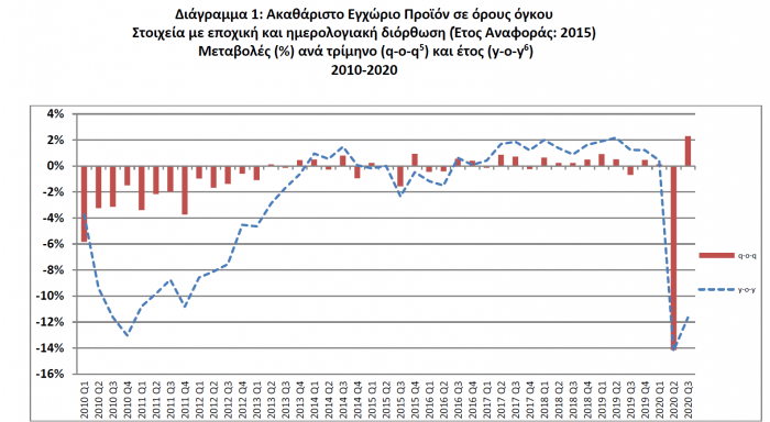Σύμφωνα με τα προσωρινά στοιχεία τα οποία ανακοίνωσε η ΕΛΣΤΑΤ, το ΑΕΠ σε όρους όγκου σε εποχικά προσαρμοσμένη βάση παρουσίασε αύξηση 2,3% στο γ’ τρίμηνο σε σύγκριση με το προηγούμενο και συρρίκνωση 11,7% σε ετήσια βάση. Βάσει των μη προσαρμοσμένων στοιχείων και σε ετήσια βάση η συρρίκνωση διαμορφώθηκε στο 9,7%.