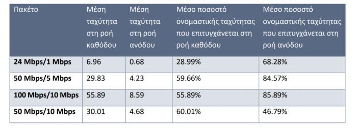 Είναι χαρακτηριστικό ότι στα πακέτα 50 και 100 Mbps, οι πραγματικές ταχύτητες είναι 30 και 56 Mbps, αντίστοιχα και κινούνται στο 55% - 60% της ονομαστικής τιμής. Απογοητευτικό είναι το γεγονός πως στις συνδρομές πακέτων 24 Mbps που εξακολουθούν να αποτελούν και την πλειονότητα των συνδέσεων, οι συνδρομητές πιάνουν μόλις το 29% της ονομαστικής ταχύτητας με 7 Mbps.