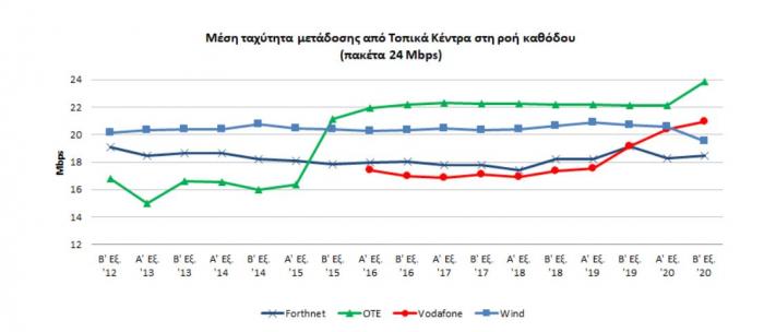 Σύμφωνα με τα στοιχεία της ΕΕΤΤ για την μέση ταχύτητα μετάδοσης από τα τοπικά κέντρα στα πακέτα των 24 Mbps, ο ΟΤΕ παραμένει πρώτος με ταχύτητα που φτάνει τα 24Mbps, ενώ ακολουθεί η Vodafone με 21 Mbps και τρίτη είναι η Wind με κάτω από 20 Mbps και τελευταία η Forthnet με λίγο περισσότερο από 18 Mbps.