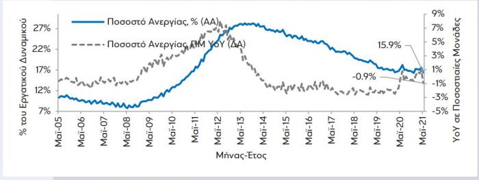 Όπως αναφέρει η Eurobank, το εποχικά διορθωμένο ποσοστό ανεργίας στην Ελλάδα μειώθηκε στο 15,9% του εργατικού δυναμικού τον Μάιο 2021 από 17,1% τον Απρίλιο 2021. Στο 5μηνο Ιανουαρίου-Μαΐου 2021 διαμορφώθηκε στο 16,6%, οριακά υψηλότερα σε σύγκριση με το αντίστοιχο διάστημα πέρυσι. Σημειώνεται ότι η Ελλάδα και η Ισπανία παραμένουν με διαφορά οι χώρες με τα υψηλότερα ποσοστά ανεργίας ανάμεσα στα κράτη μέλη της Ευρωπαϊκής Ένωσης των 27. Στην περίπτωση της ελληνικής οικονομίας, η προαναφερθείσα αρνητική πρωτιά είναι απότοκη της κρίσης χρέους και αντανακλά σε έναν βαθμό την απόκλιση ανάμεσα στο πραγματικό ΑΕΠ του 2019 με αυτό του 2007 (-23,5%).