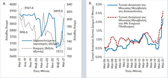 Η μείωση του ποσοστού ανεργίας σε μηνιαία βάση τον Μάιο 2021 αντικατοπτρίζει την αύξηση της απασχόλησης. Αναλυτικά, ο αριθμός των απασχολούμενων ενισχύθηκε κατά 168,5 χιλιάδες άτομα (4,5%) όταν τον Ιανουάριο 2021 είχε μειωθεί κατά 231,4 χιλιάδες άτομα (5,9%). Η άνοδος της απασχόλησης τον Μάιο 2021 δύναται να συνδεθεί με το σταδιακό άνοιγμα της οικονομίας και την έναρξη της τουριστικής περιόδου. Η κύρια δεξαμενή άντλησης των εν λόγω πόρων ήταν ο μη ενεργός πληθυσμός (πτώση κατά 141,4 χιλιάδες άτομα ή 4,2%) και ακολούθησε το σύνολο των ανέργων (μείωση κατά 31 χιλιάδες άτομα ή 4%).