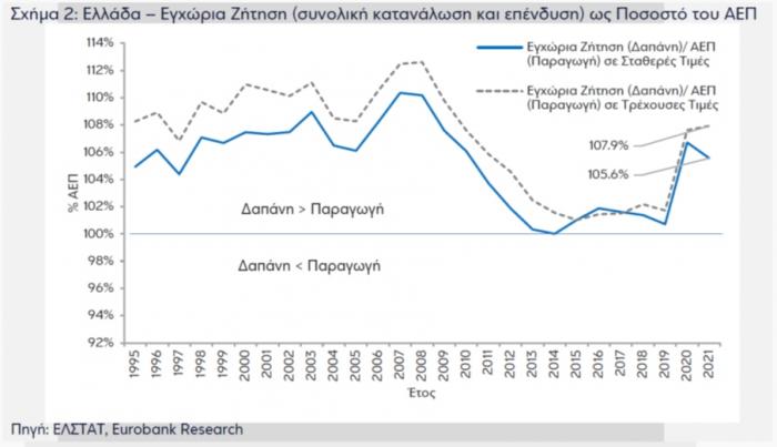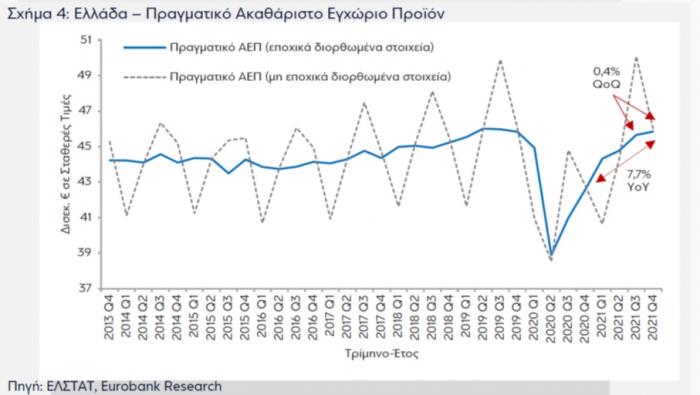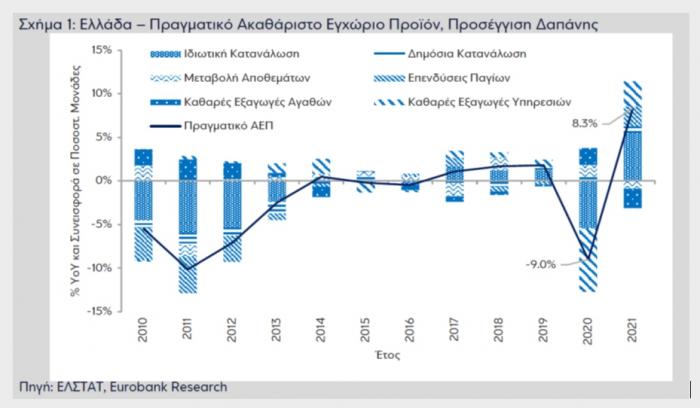 Σε πολύ μικρή απόσταση από το επίπεδο του 2019 βρέθηκε το 2021 το ελληνικό ΑΕΠ, καλύπτοντας το χαμένο έδαφος από την πανδημία. Τα εκτεταμένα μέτρα στήριξης από το κράτος στις επιχειρήσεις και τα νοικοκυριά δεν έφεραν υπεραπόδοση σε σχέση με τις τελευταίες εκτιμήσεις διεθνών οργανισμών για την ανάπτυξη της οικονομίας, όμως το τελικό αποτέλεσμα για το 2021 ήταν σαφώς καλύτερο από τις αρχικές εκτιμήσεις, όπως επισημαίνουν οι αναλυτές της Eurobank.