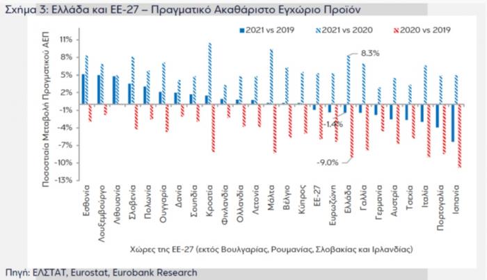 - Λαμβάνοντας υπόψιν την ύφεση το 2020 και την ανάκαμψη το 2021, το ετήσιο πραγματικό ΑΕΠ της Ελλάδας το 2021 ήταν μικρότερο κατά 1,4% σε σύγκριση με το 2019 (σε επίπεδο τριμήνου, το πραγματικό ΑΕΠ της Ελλάδας το 4ο τρίμηνο 2021 ήταν ίσο με το αντίστοιχο του 4ου τριμήνου 2019). Στο Σχήμα 3 παρουσιάζονται οι αντίστοιχες επιδόσεις των χωρών της ΕΕ-27 (εκτός της Βουλγαρίας, της Ρουμανίας, της Σλοβακίας και της Ιρλανδίας). Η κατάταξη των οικονομιών έχει ως εξής (πραγματικό ΑΕΠ 2021 vs 2019): Εσθονία 5,2%, Λουξεμβούργο 5,0%, Λιθουανία 4,8%, Σλοβενία 3,5%, Πολωνία 3,0%, Ουγγαρία 2,1%, Δανία 2,0%, Σουηδία 1,7%, Κροατία 1,5%, Φινλανδία 0,9%, Ολλανδία 0,8%, Λετονία 0,8%, Μάλτα 0,3%, Βέλγιο 0,3%, Κύπρος 0,3%, ΕΕ-27 -0,9%, Ευρωζώνη -1,4%, Ελλάδα -1,4%, Γαλλία -1,4%, Γερμανία -1,8%, Αυστρία -2,6%, Τσεχία -2,7%, Ιταλία -3,0%, Πορτογαλία -3,9% και Ισπανία -6,4%. Συνεπώς, σε όρους μεταβολής του πραγματικού ΑΕΠ στη διετία της πανδημίας, η επίδοση της ελληνικής οικονομίας ήταν παρόμοια με αυτή της Ευρωζώνης, καλύτερη σε σύγκριση με άλλες χώρες του Νότου όπως η Ισπανία, η Πορτογαλία και η Ιταλία, αλλά χειρότερη σε σχέση με την Κροατία, τη Μάλτα και την Κύπρο.