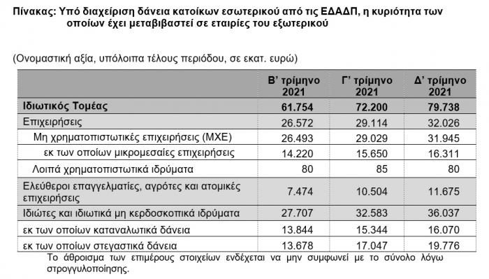 Αύξηση κατά 7.538 εκατ. ευρώ παρουσίασε, κατά το δ’ τρίμηνο του 2021, η ονομαστική αξία των δανείων του εγχώριου ιδιωτικού τομέα, τα οποία διαχειρίζονται οι εγχώριες εταιρείες διαχείρισης (ΕΔΑΔΠ) και έχουν μεταβιβαστεί σε εξειδικευμένα χρηματοπιστωτικά ιδρύματα του εξωτερικού, σύμφωνα με τα στοιχεία που έδωσε στη δημοσιότητα η Τράπεζα της Ελλάδος.