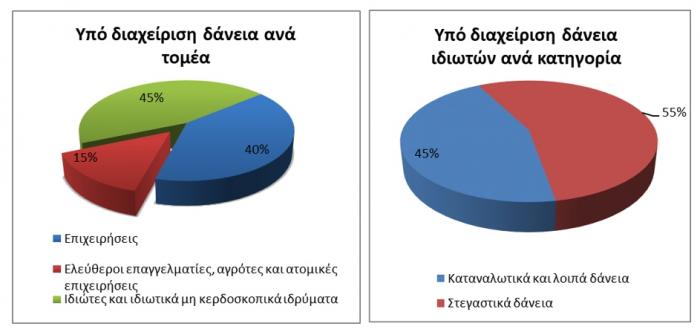 Η ονομαστική αξία των υπό διαχείριση επιχειρηματικών δανείων ανήλθε σε 32.026 εκατ. ευρώ στο τέλος του δ’ τριμήνου του 2021, από 29.114 εκατ. ευρώ στο τέλος του προηγούμενου τριμήνου. Αναλυτικότερα, η ονομαστική αξία των δανείων προς τις μη χρηματοπιστωτικές επιχειρήσεις (ΜΧΕ) αυξήθηκε κατά 2.916 εκατ. ευρώ και διαμορφώθηκε σε 31.945 εκατ. ευρώ στο τέλος του δ’ τριμήνου του 2021. Από τα υπό διαχείριση δάνεια προς τις ΜΧΕ, ποσό 16.311 εκατ. ευρώ αφορά δάνεια προς μικρομεσαίες επιχειρήσεις (ΜΜΕ). Η ονομαστική αξία των υπό διαχείριση δανείων προς λοιπά χρηματοπιστωτικά ιδρύματα μειώθηκε κατά 5 εκατ. ευρώ στα 80 εκατ. ευρώ στο τέλος του δ’ τριμήνου του 2021.