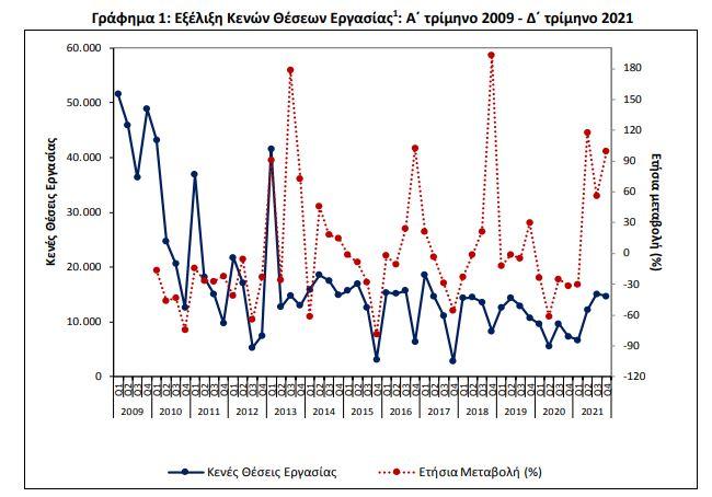 Αύξηση 99,3% σημείωσε ο αριθμός των κενών θέσεων εργασίας, στο σύνολο της οικονομίας εκτός από τον πρωτογενή τομέα και τις δραστηριότητες των νοικοκυριών, το δ' τρίμηνο πέρυσι σε σύγκριση με το δ' τρίμηνο του 2020 (14.713 και 7.382 θέσεις αντίστοιχα), έναντι μείωσης 31,4% κατά την αντίστοιχη σύγκριση το 2020 προς το 2019.