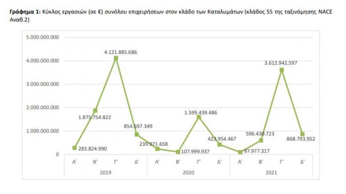 Έτσι για τις επιχειρήσεις του κλάδου καταλυμάτων με υποχρέωση τήρησης διπλογραφικών βιβλίων, για τις οποίες υπάρχουν διαθέσιμα στοιχεία σε μηνιαία βάση, ο κύκλος εργασιών τον Ιανουάριο 2022 ανήλθε σε 67.460.725 ευρώ, σημειώνοντας αύξηση 246,4% σε σχέση με τον Ιανουάριο 2021, όπου είχε ανέλθει σε 19.476.243 ευρώ.