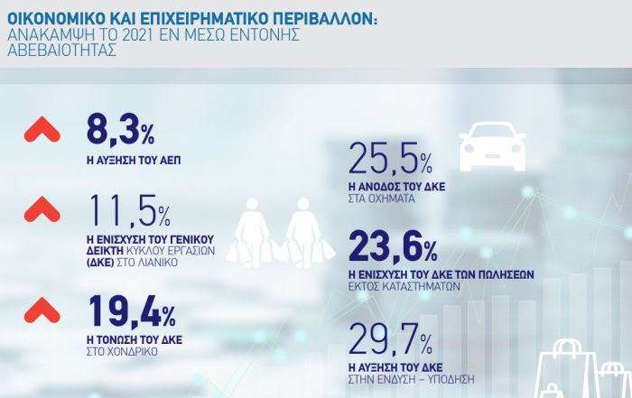 - Φαίνεται ότι για το 2021 οι δράσεις στήριξης της εγχώριας αγοράς κατά τη διάρκεια του Covid-19 είχαν θετικό αποτύπωμα στην επιχειρηματικότητα. Υπό «κανονικές συνθήκες», η σταδιακή επιστροφή στην μετά-πανδημική πραγματικότητα θα μπορούσε να συμπαρασύρει ανοδικά τα βασικά μεγέθη των επιχειρήσεων. Άλλωστε, ήδη ο συνολικός κύκλος εργασιών αυξήθηκε, υπεραντισταθμίζοντας τις περυσινές απώλειες, ιδίως στο Χονδρικό και στα Οχήματα.