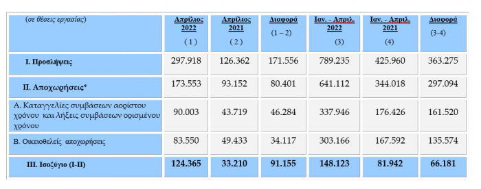Έτσι, το ισοζύγιο των ροών μισθωτής απασχόλησης του πρώτου τετραμήνου του έτους 2022 ήταν θετικό και διαμορφώθηκε στις 148.123 θέσεις εργασίας.