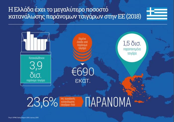 Τα 3,9 δισ. έφτασαν τα παράνομα τσιγάρα που καταναλώθηκαν στην Ελλάδα, εκ των οποίων το 1,5 δισ. ήταν απομιμητικά σύμφωνα με την ετήσια μελέτη Stella της KPMG η οποία εκτιμά το μέγεθος και την εξέλιξη της παράνομης αγοράς τσιγάρων στην ΕΕ. Η αυξητική τάση που καταγράφεται οδηγεί σε σημαντικά χαμένα έσοδα για την κυβέρνηση, της τάξεως των 700 - κατά προσέγγιση - εκατομμυρίων το χρόνο. Παράλληλα, σύμφωνα με την έρευνα, οι αυξημένες έφοδοι σε παράνομα εργοστάσια την περασμένη χρονιά, δείχνουν την αλλαγή δράσης των εγκληματικών οργανώσεων, από την εισαγωγή παράνομων προϊόντων, σε εγχώρια, πλέον, παραγωγή.