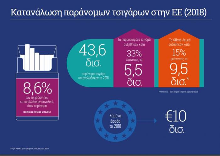 Η μελέτη Stella της KPMG για την κατανάλωση παράνομων τσιγάρων στην ΕΕ το 2018, η οποία εκδόθηκε τον Ιούνιο 2019, αποκάλυψε ότι καταναλώθηκαν στην Ευρωπαϊκή Ένωση 43,6 δισ. παράνομα τσιγάρα, ποσότητα ισοδύναμη σε μέγεθος με το σύνολο της νόμιμης αγοράς πωλήσεων τσιγάρων του Ηνωμένου Βασιλείου, της Αυστρίας και της Δανίας. Αυτή η πραγματικότητα κόστισε στις κυβερνήσεις 10 δισ. ευρώ χαμένα έσοδα.