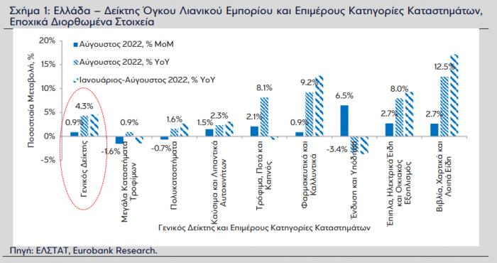 Πιο αναλυτικά σημειώνεται ότι σύμφωνα με τα στοιχεία της Ελληνικής Στατιστικής Αρχής (ΕΛΣΤΑΤ), ο δείκτης όγκου λιανικού εμπορίου, ένα μέγεθος που δείχνει τις πωλήσεις του εν λόγω κλάδου σε σταθερές τιμές και παρουσιάζει ισχυρή θετική συσχέτιση με την ιδιωτική κατανάλωση, ενισχύθηκε κατά 0,9% MoM / 4,3% ΥοΥ τον Αύγουστο 2022 από 1,5% MoM / 1,4% ΥοΥ τον Ιούλιο 2022.