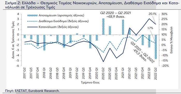 Ως εκ τούτου, η αποταμίευση των νοικοκυριών από το θετικό έδαφος των €1,1 δισεκ. (3,4% ως ποσοστό του διαθέσιμου εισοδήματος) το δεύτερο τρίμηνο 2021 συρρικνώθηκε στο αρνητικό έδαφος των 4,7 δισεκ. (14,2% ως ποσοστό του διαθέσιμου εισοδήματος) το δεύτερο τρίμηνο 2022. Βάσει των στοιχείων των εν λόγω λογαριασμών αποδεικνύεται ότι οι συσσωρευμένες αποταμιεύσεις των νοικοκυριών κατά τη διάρκεια της πανδημίας, €8,9 δισεκ. σωρευτικά από το δεύτερο τρίμηνο 2020 μέχρι το δεύτερο τρίμηνο 2021, χρηματοδότησαν σε υψηλό βαθμό την ανάκαμψη της κατανάλωσης των νοικοκυριών. Σημειώνεται ότι από το τρίτο τρίμηνο 2021 μέχρι το δεύτερο τρίμηνο 2022 οι συσσωρευμένες αποταμιεύσεις των νοικοκυριών ήταν αρνητικές στα €9,3 δισεκ (βλέπε Σχήμα 2).