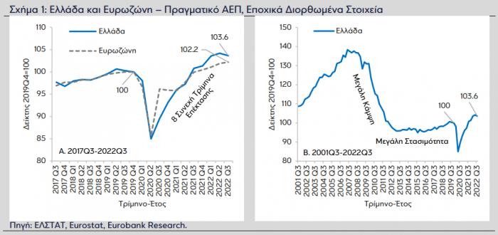 Συγκεκριμένα, το πραγματικό ΑΕΠ του τρίτου και του τετάρτου τριμήνου 2021 αναθεωρήθηκε προς τα πάνω κατά 0,8% και 0,4% αντίστοιχα και το πραγματικό ΑΕΠ του πρώτου και του δευτέρου τριμήνου 2022 αναθεωρήθηκε προς τα κάτω κα-τά 0,3% και 0,9% αντίστοιχα. Για το σύνολο της περιόδου Ιανουαρίου-Σεπτεμβρίου 2022, ο πραγματικός ρυθμός μεγέθυνσης ανήλθε στο 5,9% υπεραποδίδοντας έναντι της Ευρωζώνης (4,0%). Τέλος, σε σύγκριση με τα προ πανδημίας επίπεδα, το πραγματικό ΑΕΠ στην Ελλάδα το τρίτο τρίμηνο 2022 ήταν υψηλότερο κατά 3,6% (2,2% στην Ευρωζώνη), παρά ταύτα σε σύγκριση με την κορυφή του προηγούμενου οικονομικού κύκλου (δεύτερο τρίμηνο 2007, €63,4 δισεκ.) παρέμεινε μικρότερο κατά 25,1% (βλέπε Σχήμα 2Α).