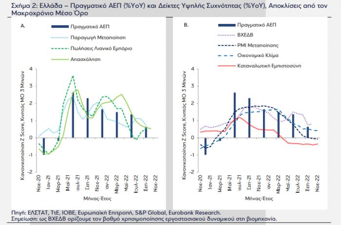 Βάσει της πορείας πολλών δεικτών υψηλής συχνότητας (hard and soft data), η επιβράδυνση της ελληνικής οικονομίας ήταν σε έναν βαθμό αναμενόμενη. Όπως παρουσιάζεται στα Σχήματα 2Α και 2Β, ήδη από το δεύτερο τρίμηνο 2022 λόγω του πολέμου στην Ουκρανία και της μεγάλης αύξησης του πληθωρισμού, το οικονομικό κλίμα, η καταναλωτική εμπιστοσύνη και ο δείκτης PMI μεταποίησης κατέγραψαν χειροτέρευση. Επιπρόσθετα, οι ρυθμοί αύξησης της απασχόλησης και του λιανικού εμπορίου σημείωσαν επιβράδυνση (εν μέρει και λόγω της εξάλειψης των αποτελεσμάτων βάσης).